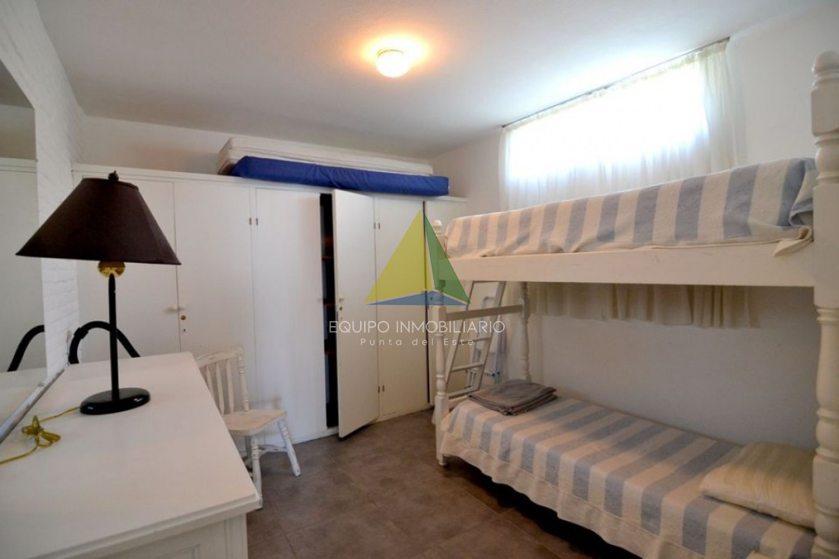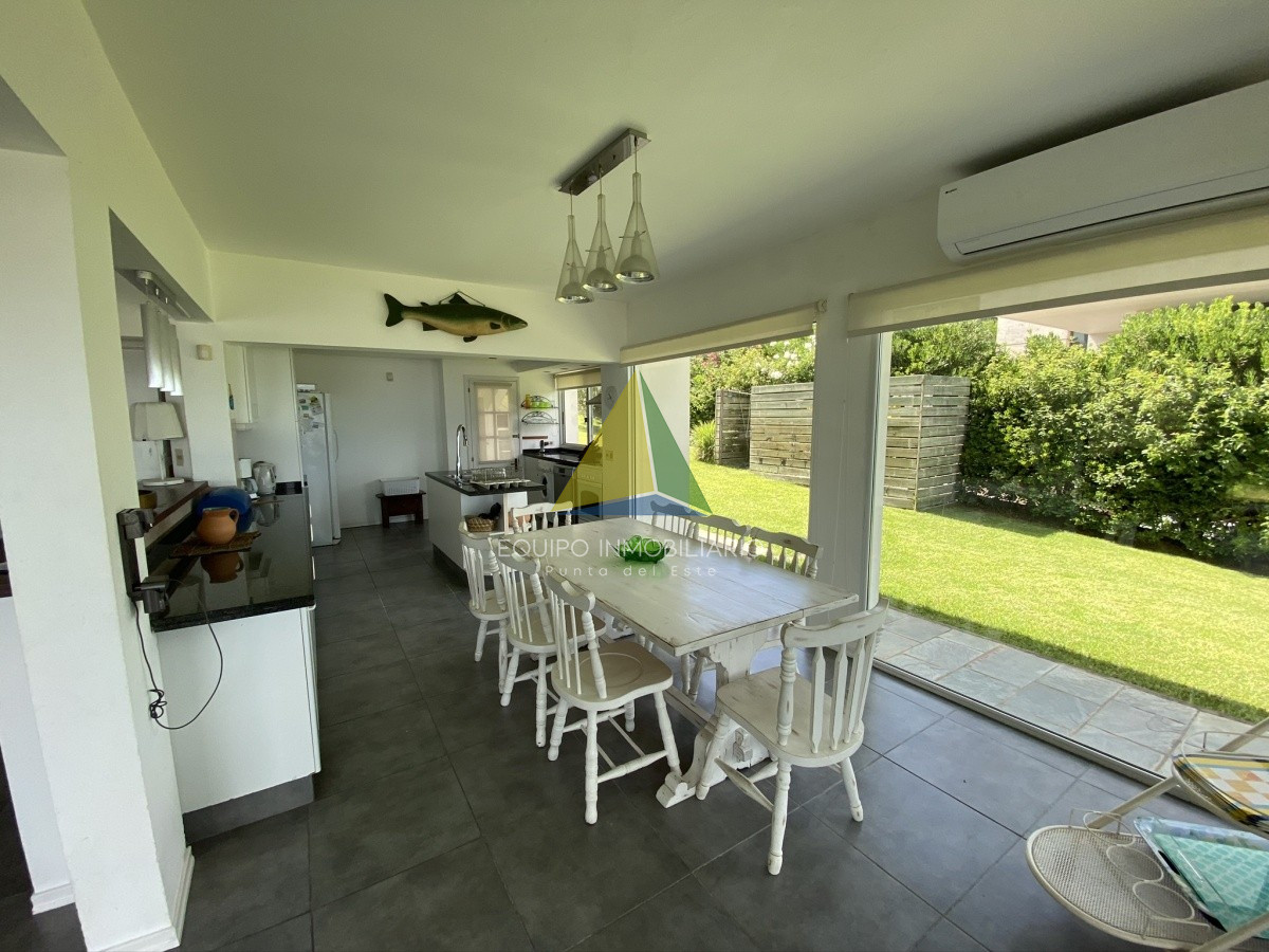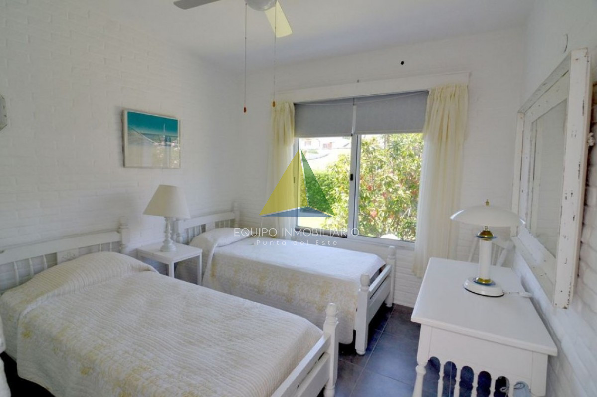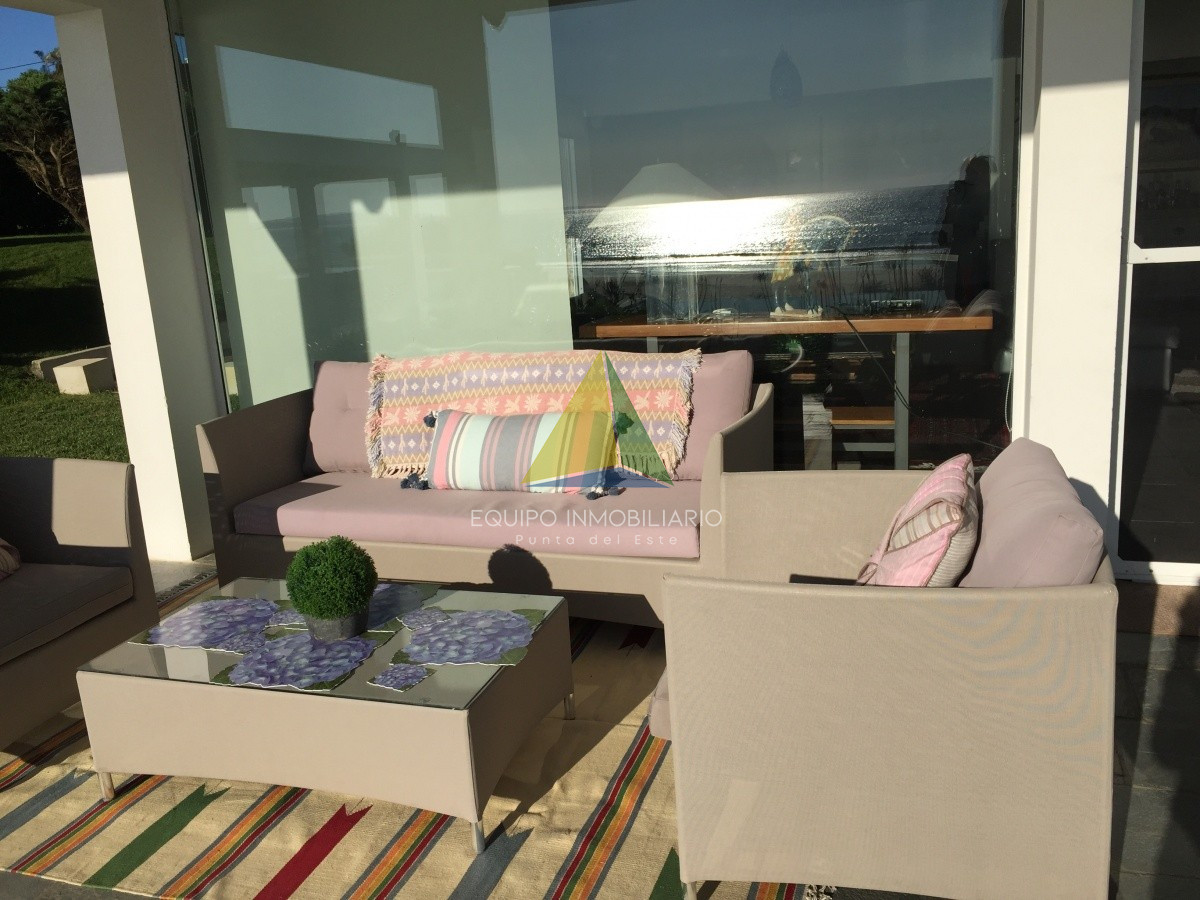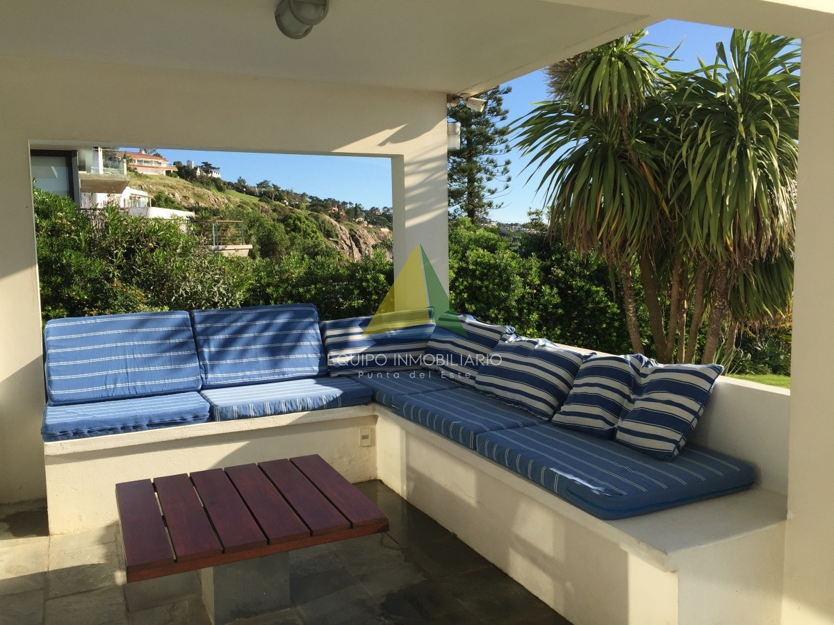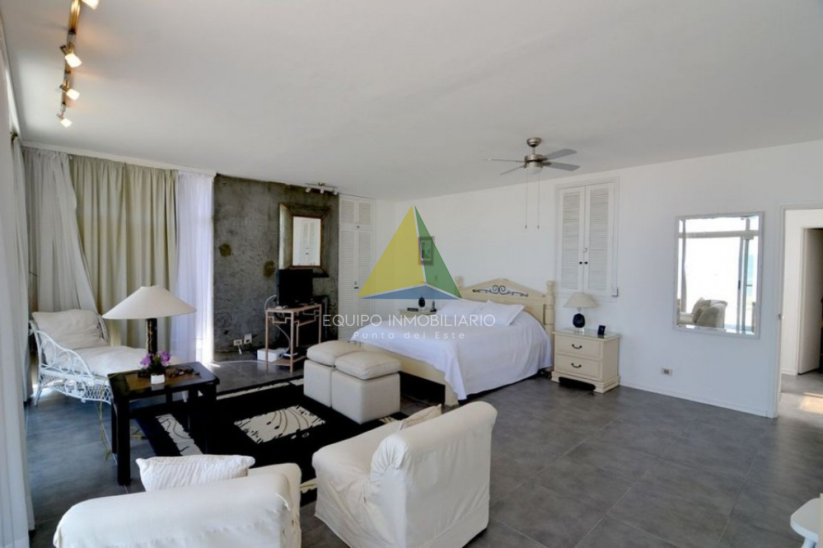Clásico chalet en salida l mar, ambientes amplios luminosos con vista directa a la bahía, amplio living comedor, cocina integrada estilo americana con comedor diario, 4 dormitorios, tres baños completos, suite principal con gran balcón a los pié de la costa y jardín, servicio integrado con baño, estar con parrillero, piscina, jardín, alarma, wi-fi en una de las zonas mas buscada de Punta Ballena.